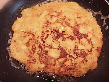 [ © Kirsten Wagner ] Erhitze Butter in einer Pfanne und brate den Teig in zwei Portionen! Zum Wenden nimmst du am besten einen Teller zu Hilfe.