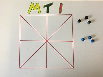 Das Spiel MTI ist so eine Art vereinfachtes "Mühle-Spiel". In afrikanischen Ländern wie Mosambik ist es sehr beliebt und wird vor allem von Kindern gerne gespielt. Man braucht nur ein Spielfeld wie hier bei uns in der Skizze und zwei mal drei Spielsteine, bei denen jeder Spieler eine Farbe hat.
