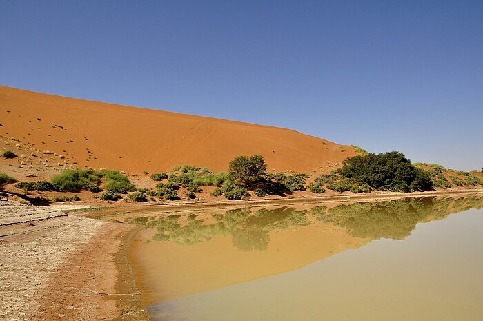 Die Namib liegt jedoch nicht nur in Namibia, sondern beginnt schon an der Küste von Angola und reicht bis runter nach Südafrika. Die Namib reicht bis zu 160 Kilometer ins Land hinein. In der Namib liegen die höchsten Sandberge der Welt. Von den Gipfeln der Dünen kann man über die endlose Wüste blicken.