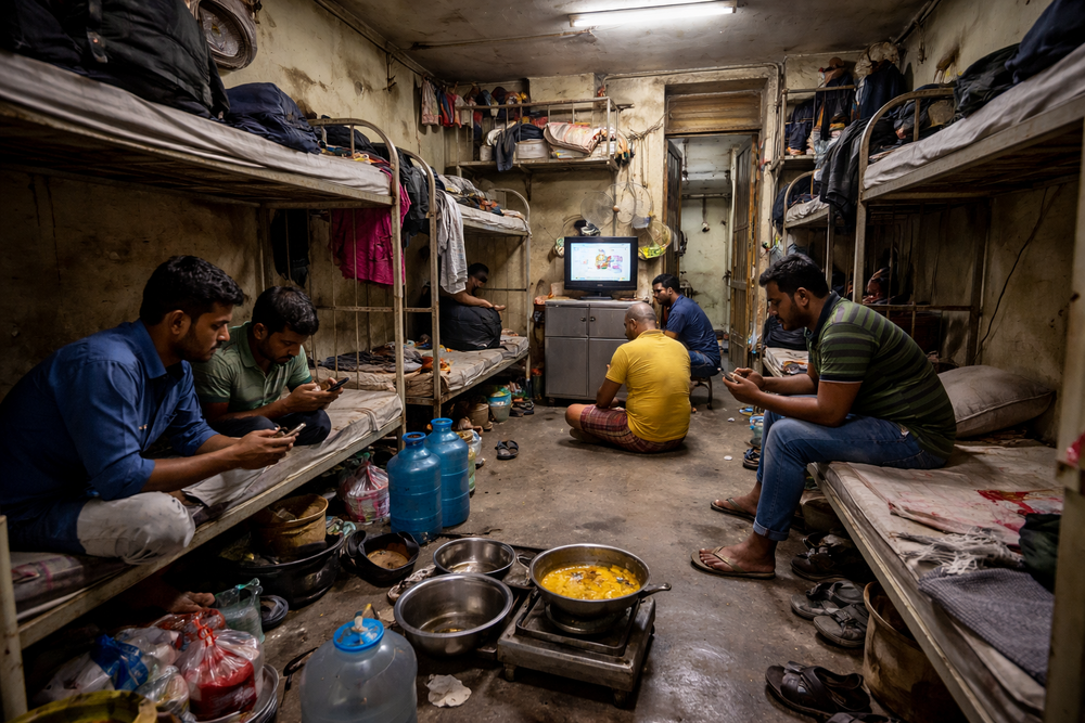 Diese Arbeiter*innen wohnen oft nicht in großen Häusern, sondern in engerem Wohnraum wie kleinen Apartments oder Sammelunterkünften. Manchmal sind viele Menschen zusammen in einem Gebäude oder in einem großen Haus untergebracht, das nur aus Wohnräumen für Arbeiter besteht. In einigen Fällen gab es Probleme mit Überfüllung und fehlender Sicherheit, was bei einem Brand 2024 in einem Wohnhaus in Mangaf tragisch deutlich wurde. Bei diesem Brand kamen viele Arbeiter ums Leben.