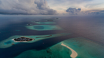Wenn du von oben auf diese Inseln schaust, dann erkennst du die Atolle. Atolle bestehen aus vielen kleinen, schmalen Inseln. Diese Inseln sind Korallenriffe. Sie umschließen eine Lagune. Sie bilden selbst eine Art ringförmige Insel. Von oben sehen die manchmal aus wie eine Insel mit einem Loch drin oder ein Ring auf dem Meer. Das Wort Atoll stammt übrigens aus der maledivischen Sprache, dem Dhivehi.