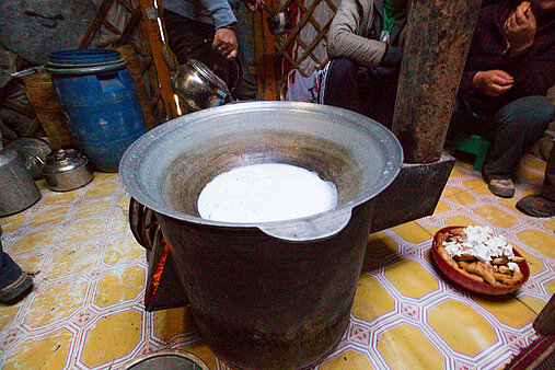 Fleisch dient auch als Reiseproviant. Es wird getrocknet und gemahlen. Dadurch ist es lange haltbar. Man muss es nur noch mit heißem Wasser überbrühen und schon hat man so etwas wie eine fertige Fleischbrühe. Das ist so ähnlich wie unsere Tütensuppen, nur mit weniger Konservierungsstoffen! Dieses getrocknete Fleisch heißt übrigens Borts und besteht meist aus Rind- oder Yakfleisch, manchmal auch aus Kamel oder Pferd. Es hält sich übrigens über viele Jahre - wie die Tütensuppe. Mongolen auf dem Land kochen meistens in ihren Jurten und stellen einen kleinen Ofen in der Jurte auf. Tierdung - davon gibt es ja genug - dient dann als Material zum Heizen des kleinen Ofens.