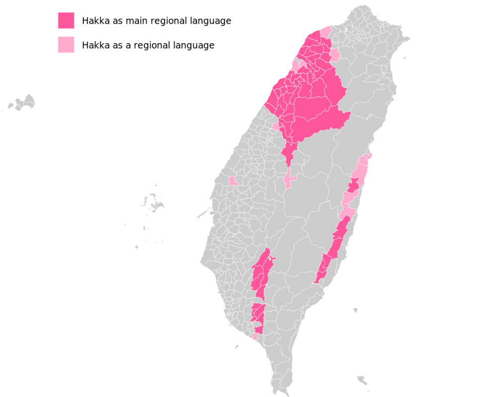 Auf Taiwan leben die meisten Hakka.-Sprecher im Nordwesten der Insel. 6,6 Prozent der Taiwanesen sprechen zu Hause Hakka.