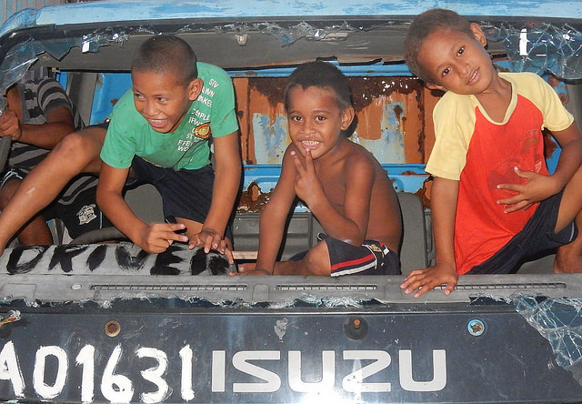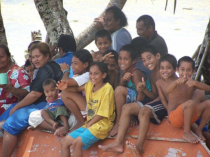 Hier siehst du Kinder aus Tuvalu. Sie warten gerade auf ein Frachtboot und freuen sich über die Ankunft des Bootes. [ © Cesqld / gemeinfrei ] -