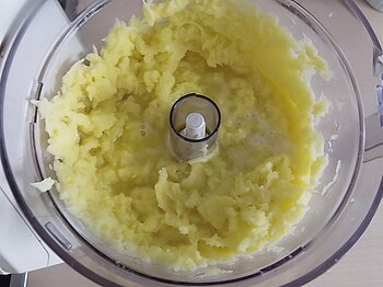 Reibe die Kartoffeln. Das geht am schnellsten mit einer Küchenmaschine. Versuche, etwas von dem Kartoffelwasser abzugießen, damit die Masse nicht ganz so flüssig ist.