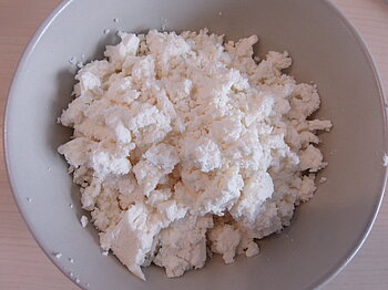 Schneide den Schafskäse in kleine Würfel und zerdrücke diese dann mit der Gabel. Noch schneller geht das Zerdrücken einfach durch das Zerbröseln mit der Hand.
