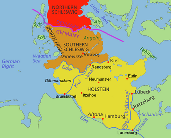 Südschleswig ist darum heute der nördliche Landesteil, Holstein ist der südliche Landesteil vom heutigen Bundesland Schleswig-Holstein.