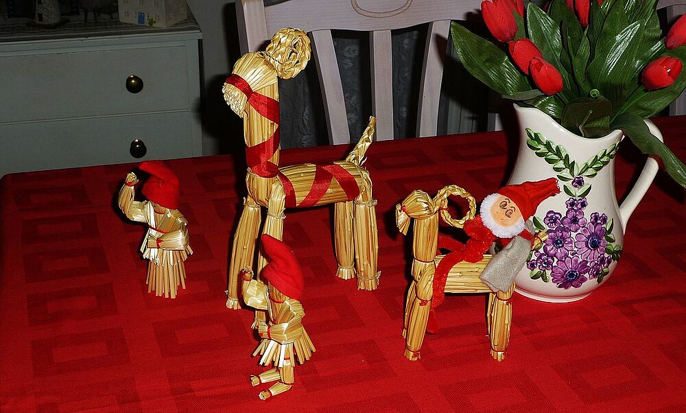 Einen Weihnachtsbaum haben die Schweden auch. Eine typische Dekoration ist der Julbock: eine Ziegenbockfigur aus Stroh. Bevor der Weihnachtsmann (Jultomte) die Geschenke brachte, soll das der Julbock getan haben... Na dann: God Jul - Frohe Weihnachten!