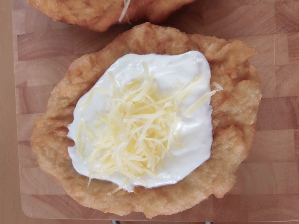 Gib auf die warmen Lángos etwas von der Knoblauchcreme und bestreue sie noch mit dem geriebenen Käse. Warm genießen! "Jó étvágyat!" - Das bedeutet Guten Appetit auf Ungarisch.