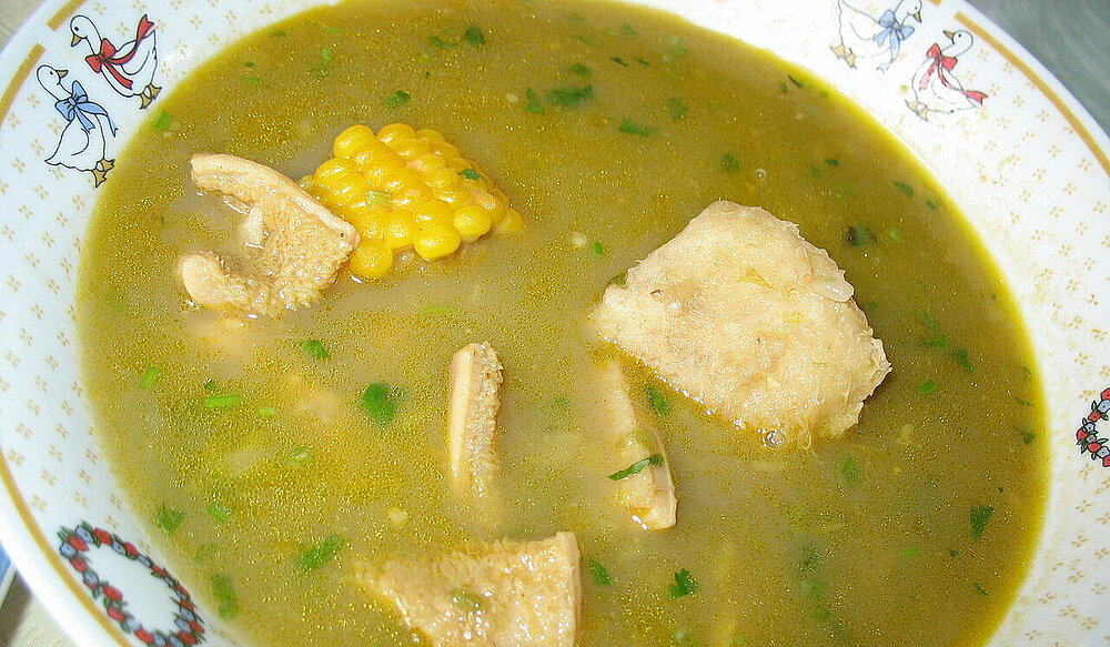 Oft sind außerdem Maniok und Maiskolben enthalten oder die bei uns unbekannten Knollen von Taro und Otoe. Dazu gibt es Reis, den man entweder in die Suppe tut oder dazu isst.