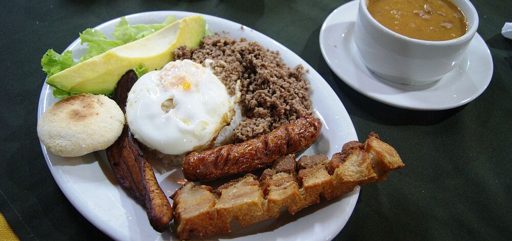 Ein typisches Gericht aus den Anden Kolumbiens, besonders aus Antioquia, ist Bandeja paisa. Bandeja bedeutet eigentlich Tablett. Paisa nennt man die Region im Nordwesten Kolumbiens.
