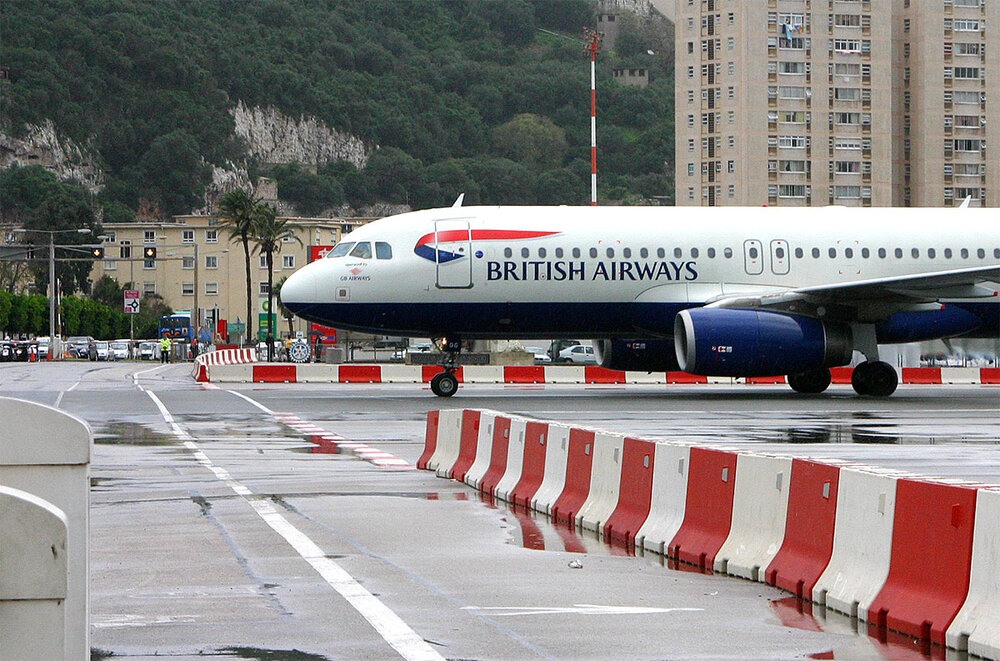 Die Grenze zu Spanien ist 1,2 Kilometer lang. Nördlich der Grenze liegt die spanische Stadt La Línea de la Concepción. Zwischen Spanien und Gibraltar liegt der Flughafen von Gibraltar. Bis März 2023 mussten alle Besucher über das Flugfeld laufen oder fahren. Inzwischen gibt es für Autos einen Tunnel.