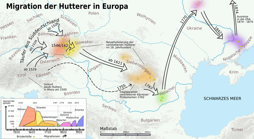 So ging es schon 1770 weiter, und zwar nach Russland. Im heutigen Gebiet der Ukraine, 100 Kilometer östlich von Kiew, bauten sich die Hutterer erneut eine Siedlung. Mehr als 100 Jahre blieb man hier. Allerdings spaltete sich die Gemeinschaft, denn einige wollten nicht weiter auf Eigentum verzichten (Eigentümler), andere die Gütergemeinschaft behalten (Gemeinschaftler).