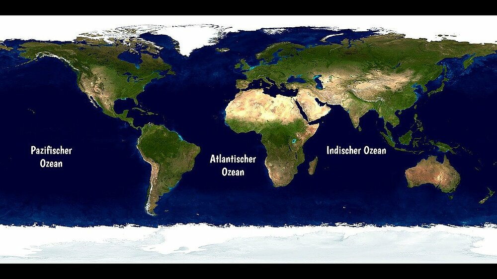 Die größten Meere der Erde nennt man auch Ozeane. Ein anderes Wort ist "Weltmeer". Die drei größten Ozeane sind der Atlantische, der Pazifische und der Indische Ozean. Hinzu kommen noch der Arktische und der Südliche Ozean, die man aber auch als Teile der anderen Ozeane werten kann. Klick auf das Bild zum Vergrößern!