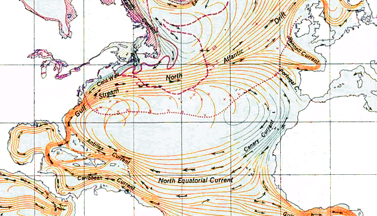 Die vier Meeresströmungen, die die Sargassosee begrenzen sind im Norden der Golfstrom, der sich aus dem Antillenstrom entwickelt, und im Nordosten der Nordatlantikstrom. Der verlängert den Golfstrom in Richtung Europa. Im Südosten folgt der Kanarenstrom, der im Süden wiederum in den Nordäquatorialstrom übergeht. Auf der Karte kann man diesen riesigen Wirbel gut sehen. Das Wasser in der Sargassosee selbst ist meistens ruhig und blau.