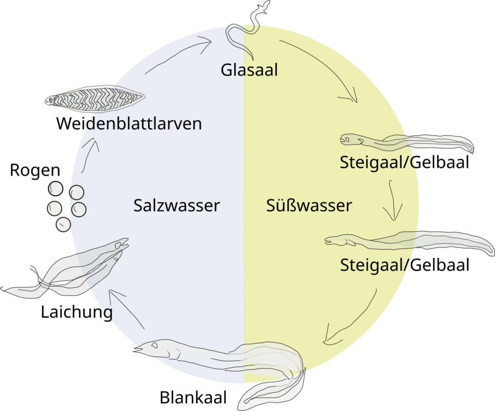 Im Laufe dieser Zeit wachsen sie und werden zunächst zu Glasaalen. Die heißen so, weil sie noch durchsichtig sind in diesem Alter. Weiter schwimmen sie über die Flüsse ins Landesinnere. Nachdem sie dort über mehrere Jahre heranwachsen, begeben sie sich wieder auf den Rückweg - um selbst zu laichen.